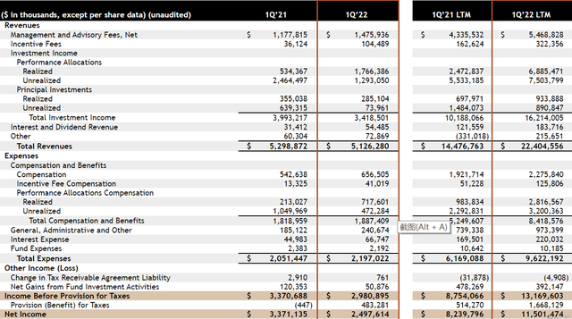 財報顯示,黑石第一季度營收51.26億美元,2021年同期為52.99億美元,同比下降3.25%;歸屬于公司凈利潤為12.17億美元,2021年同期為17.48億美元,同比下降30.4%;每股收益為1.66美元,2021年同期為2.46美元。