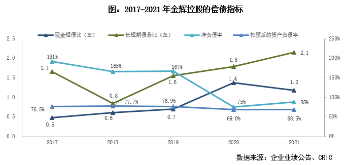 截至2021年末金輝有息負債527.94億元,較年初減少1.82%,其中短債規模同比大幅減少13.03%至167.97億元,短債占比下降至31.81%,債務結構有所優化,但仍有進一步的提升空間。金輝持有現金較年初減少25.81%至197.28億元(已抵押存款占比4.31%),降幅較大但可動用現金基本覆蓋短債。期末金輝“三條紅線”指標維持綠檔,現金短債比1.17,凈負債率較年初增加12.7pct至88%,剔除預收后的資產負債率改善至68.5%。