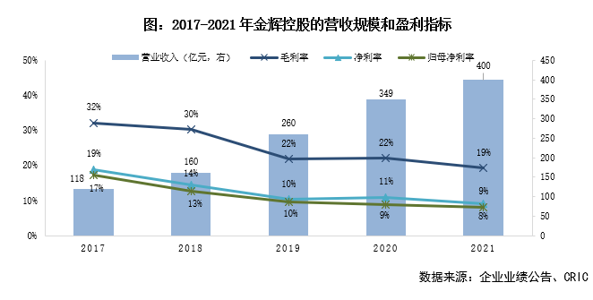 值得注意的是,2021年高權益比的并表項目陸續進入結轉,導致金輝少數股東損益占比同比減少6.77pct至11.34%,實現歸母凈利潤32.75億元,同比增長4.71%,對應歸母凈利率8.18%,同比減少0.8pct,利潤率仍有待提升。