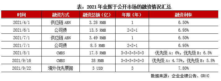 信用風險減少和融資渠道通暢,一定程度反映在金輝2021年新發行的債券上。全年金輝于公開市場融資活躍,上半年成功發行2021年第一期小公募和第一期供應鏈ABN ,7-8月成功發行2021年第二期小公募、第二期供應鏈ABN以及CMBS,9月發行一筆CMBS以及境外優先票據,融資渠道逐漸拓展。年內金輝加權平均融資成本6.58%,較去年同期的7.47%改善顯著。截至2021年末,三大國際評級機構均維持金輝控股長期發行人主體評級不變,標普給予B+/穩定,穆迪B1/穩定,惠譽B+/穩定。