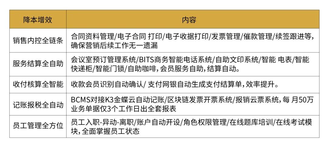 公司披露,已自主研發(fā)應用多層次的信息技術平臺和智能化系統(tǒng),包括BCMS商務中心綜合管理系統(tǒng)、BITS智能秘書接電服務系統(tǒng)、方圓間APP和社群交流平臺、銀企直連自動付款系統(tǒng)、BCMS-CLOUD自動記賬系統(tǒng)等。