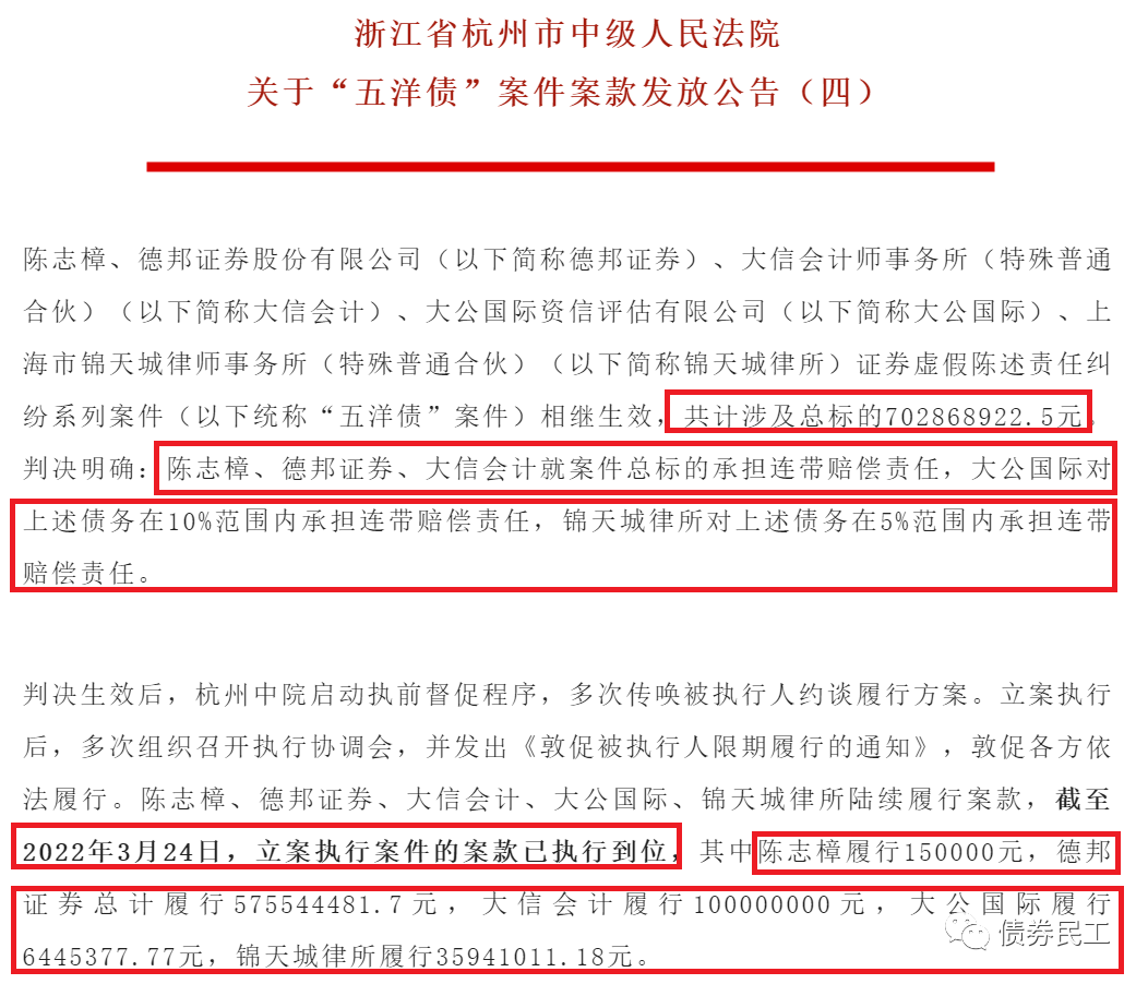 2021年1月,“五洋債”的一審判決認定,證券公司、會計師師事務所、律師事務所等債券均被判決承擔賠償責任,其中陳志樟、德邦證券、大信會計就案件總標的6.96億元承擔連帶賠償責任,大公國際資對上述債務在10%范圍內承擔連帶賠償責任,錦天城律所對上述債務在5%范圍內承擔連帶賠償責任。