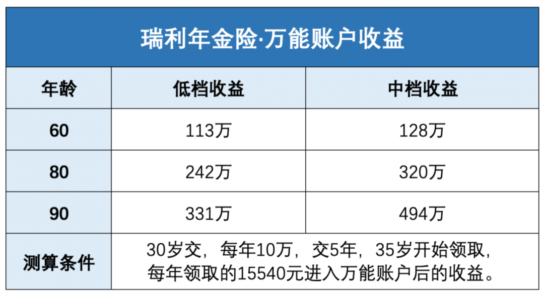 如果老王35歲領(lǐng)取時(shí)不著急用錢,把錢放到萬(wàn)能賬戶二次增值。