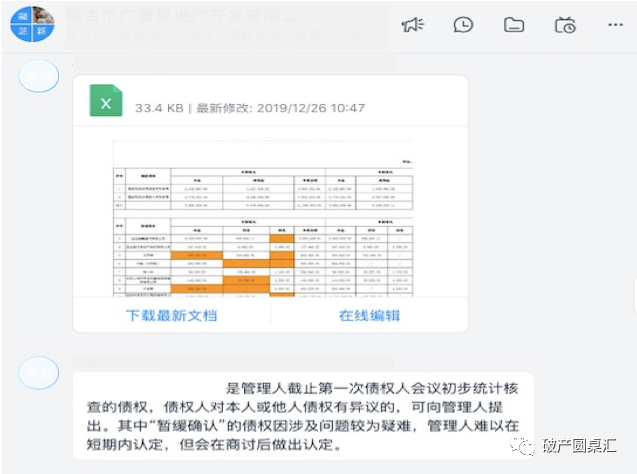 前期準(zhǔn)備工作完成,管理人可將會(huì)議資料上傳至釘釘群文件,所有債權(quán)人均可下載查閱會(huì)議流程及會(huì)議內(nèi)容。