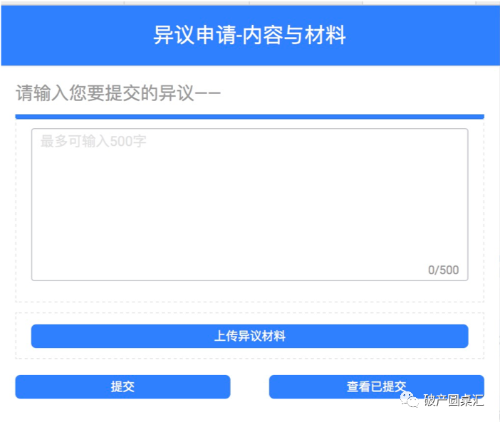 對(duì)債權(quán)表中記載的自己債權(quán)或他人債權(quán)有異議的,債權(quán)人可向管理人提出異議,債權(quán)人可點(diǎn)擊異議鏈接提交異議原因并上傳相關(guān)資料,當(dāng)前異議鏈接僅支持輸入異議原因并上傳相關(guān)資料,不能前置選擇是否存在異議,建議未來可對(duì)此加以完善,對(duì)異議鏈接可以設(shè)置前置選擇程序,對(duì)自己債權(quán)是否存在異議,如果存在則說明原因并上傳相關(guān)資料,對(duì)他人債權(quán)是否存在異議同理。