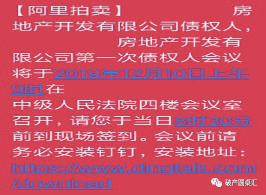 若債權(quán)申報(bào)已經(jīng)結(jié)束,可將制作的包含債權(quán)人、代理人姓名、身份證號(hào)、聯(lián)系電話的債權(quán)申報(bào)表導(dǎo)入釘釘后臺(tái),通過釘釘后臺(tái)給債權(quán)人或代理人群發(fā)邀請(qǐng)鏈接的方式邀請(qǐng)其加入債權(quán)人組織。此種方式的優(yōu)點(diǎn)為:群發(fā)短信方便快捷,缺點(diǎn)為:釘釘?shù)亩绦叛?qǐng)鏈接標(biāo)準(zhǔn)模板只能包含30個(gè)字符,由于字?jǐn)?shù)限制短信不能向債權(quán)人說明詳細(xì)內(nèi)容,會(huì)遺漏重要信息,如果自定義短信模板則需要審核,時(shí)間至少需要1-2天。同時(shí),由于通知短信為阿里釘釘平臺(tái)發(fā)送,可能被部分手機(jī)誤認(rèn)為垃圾短信攔截,根據(jù)《企業(yè)破產(chǎn)法》第六十三條規(guī)定,召開債權(quán)人會(huì)議,管理人應(yīng)當(dāng)提前十五日通知已知的債權(quán)人。因此建議管理人最好預(yù)留足夠的時(shí)間做好通知工作,以確保程序合法。