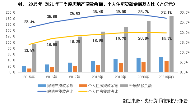 2021年三季度末,全國房地產(chǎn)貸款余額51.4萬億元,占各項貸款余額的比重進一步回落至27.1%,較2020年末再降1.6個百分點。其中,個人住房貸款余額37.4萬億元,占各項貸款余額的比重跌至19.7%,較2020年末減少0.3個百分點。