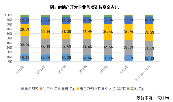 據(jù)統(tǒng)計局數(shù)據(jù)顯示,2021年1-10月,房地產(chǎn)開發(fā)企業(yè)到位資金16.7萬億元,同比增長8.8%。其中,國內(nèi)貸款2萬億元,同比下降10%,占比跌至12.1%,較2020年末減少1.7個百分點。自籌資金5.3萬億元,同比增長5.1%,占比跌至31.6%,較2020年末減少1.2個百分點。定金及預收款6.2萬億元,同比增長21%,占比升至37.2%,較2020年末增加2.8個百分點。個人按揭貸款2.7萬億元,同比增長9.7%,占比升至16%,較2020年末增加0.5個百分點。說明國內(nèi)貸款、自籌資金增長顯著受限,定金及預收款、個人按揭貸款漸成房企最為重要的資金渠道來源,企業(yè)對銷售回款的依賴度持續(xù)提升。