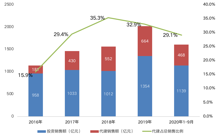 綠城代建每年可為企業(yè)貢獻30%左右的銷售額,還可幫助企業(yè)提升品牌、輸出物業(yè)管理業(yè)務(wù)。綠城目前已將旗下的綠城管理成功打造上市,根據(jù)綠城中國披露的業(yè)績公告,2020年1-9月企業(yè)共實現(xiàn)銷售額1961億元,其中代建貢獻了560億元的銷售,占企業(yè)總銷售額的比例為29%。