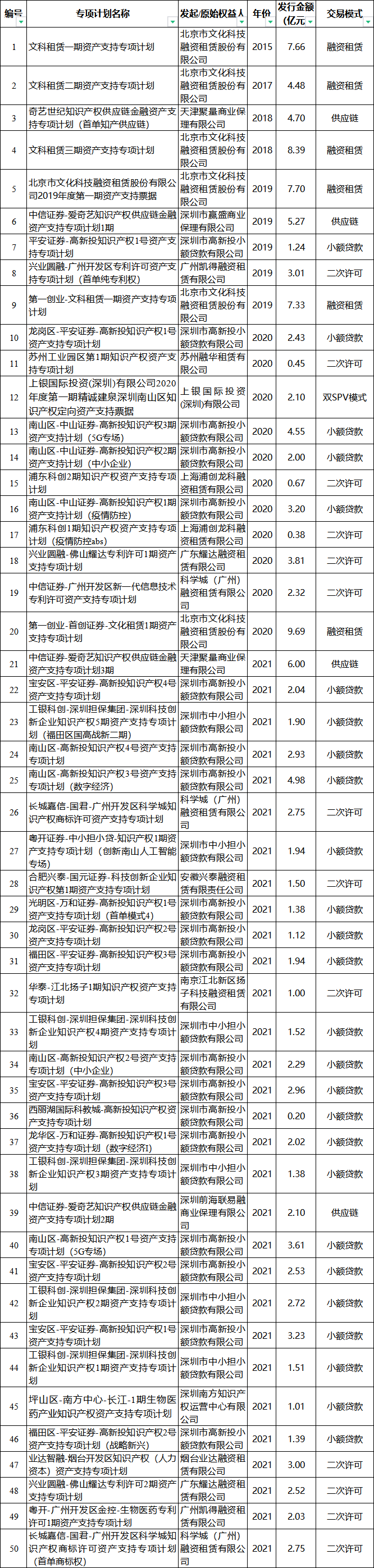 據不完全統計,目前羅湖區、寶安區、福田區、南山區、龍崗區均已出臺相關補貼政策。深圳市首創“國資主導、政府補貼、市場參與、企業獲益”的知識產權證券化模式,采用“小額貸款+專項計劃”交易結構,由深圳市中小擔小額貸款有限公司/深圳市高新投小額貸款有限公司作為原始權益人,深圳市高新投融資擔保有限公司/深圳市深擔增信融資擔保有限公司作為增信機構,以22單證券化產品、54.27億元發行金額領跑全國。