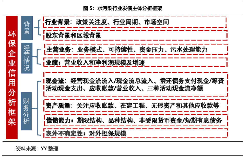 本文從背景、經營情況和財務方面構建環保行業發債主體的分析框架。由于水污染治理項目投資規模大,回款時間長,導致水污染治理行業現金流水平較弱,負債壓力持續上升。但是也得益于國資的逐步進入,行業的現金流有所改善,行業的需求也是在逐步的增加,整體的基本面支撐在增加。
