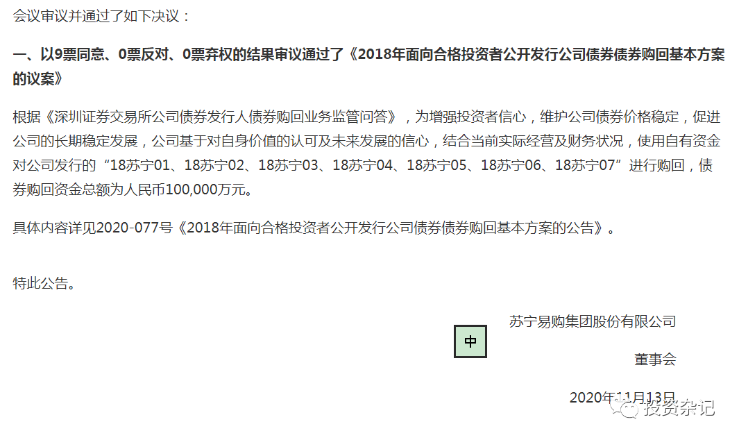 雙十一電商們忙著打折賣商品,大家忙著算數學題血拼。這雙十一剛過,打折賣東西的電商蘇寧發了公告,要回購自己存量“被打折”的債券。方案是公司掏10個億自有資金,按照董事會決議公告日(11月12日)前一交易日收盤價回購,回購涉及18蘇寧01、18蘇寧02、18蘇寧03、18蘇寧04、18蘇寧05、18蘇寧06、18蘇寧07這幾只債券。這10個億怎么分配呢,是按照這幾只債券存續金額的占比來進行資金分配的。具體的方案可以看公告。