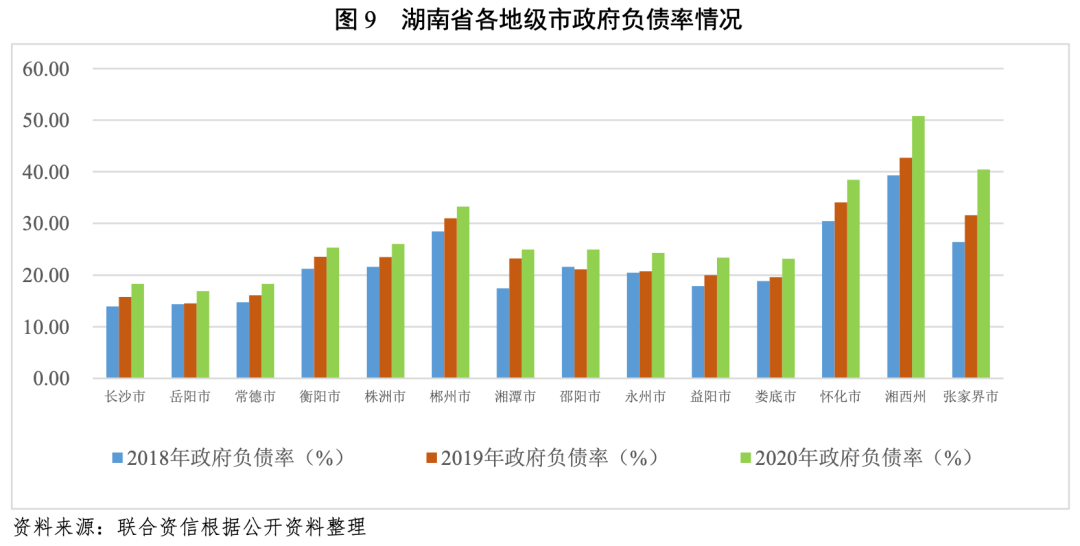 債務負擔方面,2020年,湖南省各地級市政府負債率均較上年有所增長,其中張家界市和湘西州政府負債率增長較明顯,分別較上年增加8.88個百分點和8.11個百分點。湘西州政府負債率最高(50.85%),其次為張家界市(40.45%)、懷化市(38.47%)和郴州市(33.28%),岳陽市負債率最低(16.91%),其余各地級市負債率在18%~27%之間。綜合來看,湖南省湘西州、張家界市、懷化市和郴州市政府債務負擔較重,其余各地級市債務負擔處于一般或較輕水平。