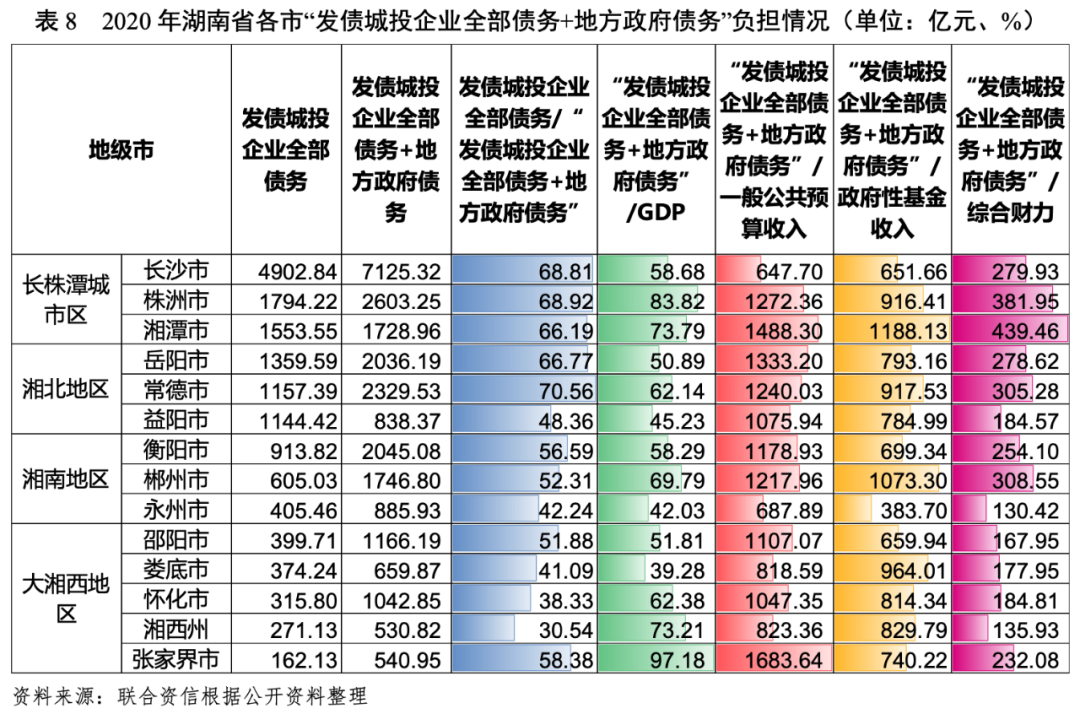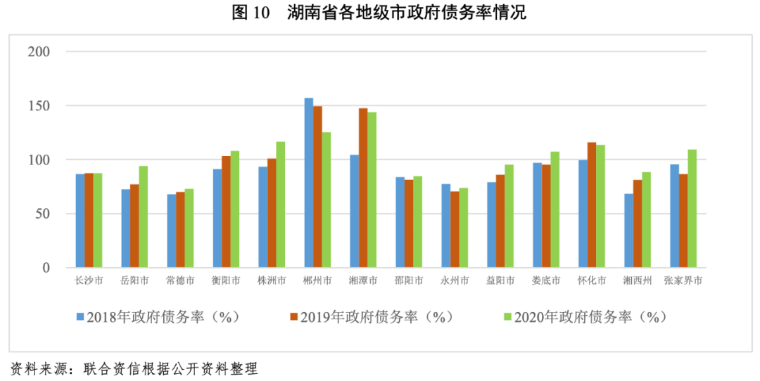 湖南省各市的債務規模差異較大,張家界市、株洲市、湘潭市和湘西州“發債城投企業全部債務+地方政府債務”/GDP的比值相對較高,湘潭市、株洲市、郴州市和常德市地方政府財政收入對“發債城投企業全部債務+地方政府債務”的覆蓋程度相對較低,永州市、湘西州和邵陽市地方政府財政收入對“發債城投企業全部債務+地方政府債務”覆蓋的程度相對偏高。