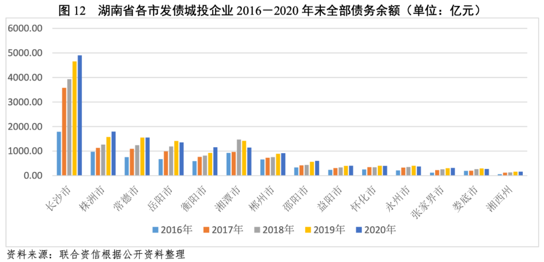 從債務總量看,2016-2020年末,湖南省城投企業有息債務存量規模大,截至2020年底,湖南省城投企業有息債務合計19037.30億元,長沙市和省本級城投債務合計占湖南省城投債務的44.60%,占比較高。