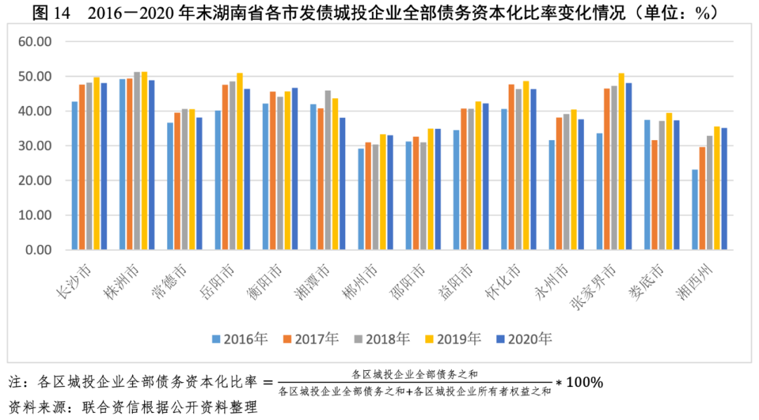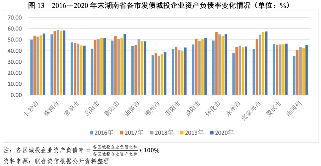 從發債城投企業全部債務與“發債城投企業全部債務+地方政府債務”的比值看,截至2020年底,長沙市、常德市、株洲市、岳陽市和湘潭市發債城投企業全部債務占地區不完全統計債務(發債城投企業全部債務+地方政府債務)的比重超過60%,其他地級市比重大部分集中在50%以下,整體處于偏高水平。