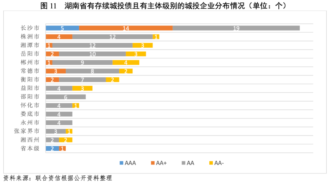 從主體信用級別區域分布看,湖南省城投企業中AAA主體共7家,集中在省本級和長沙市;AA+級城投企業28家,主要分布在長沙市、株洲市和常德市;AA級城投企業104家,占湖南省發債城投企業數量的64.60%。高信用級別城投企業集中在湖南省長株潭地區,湘西地區信用水平普遍偏低。