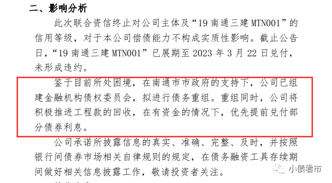 南通三建表示,重組同時(shí)其將積極推進(jìn)工程款的回收,在有資金的情況下,優(yōu)先提前兌付部分債券利息。