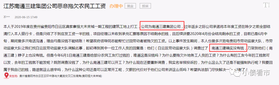 2020年6月,有網(wǎng)友在人民網(wǎng)《領(lǐng)導(dǎo)留言板》向貴陽市委書記反映,南通三建拖欠農(nóng)民工工資。后經(jīng)白云區(qū)人社局協(xié)調(diào),南通三建才將所拖欠9名員工工資全部發(fā)放,共計(jì)15.64萬元。