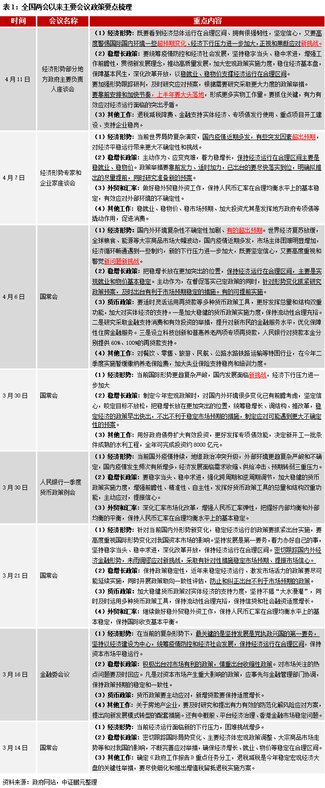 隨著國內外形勢出現的超預期變化,穩增長政策更加明確和直白。326金融委會議指出積極出臺對市場有利的政策,慎重出臺收縮性政策;3月21日國常會強調防止和糾正出臺不利于市場預期的政策;3月30日國常會要求穩定經濟的政策早出快出,不出不利于穩定市場預期的措施,開始提出要制定應對可能遇到更大不確定性的預案。4月6日國常會和最近兩次座談會對穩增長政策表述更是直截了當,有的可提前實施,靠前發力、適時加力,已出臺的要盡快落實到位,明確擬推出的盡量提前,同時研究準備新的預案,上半年要大頭落地。