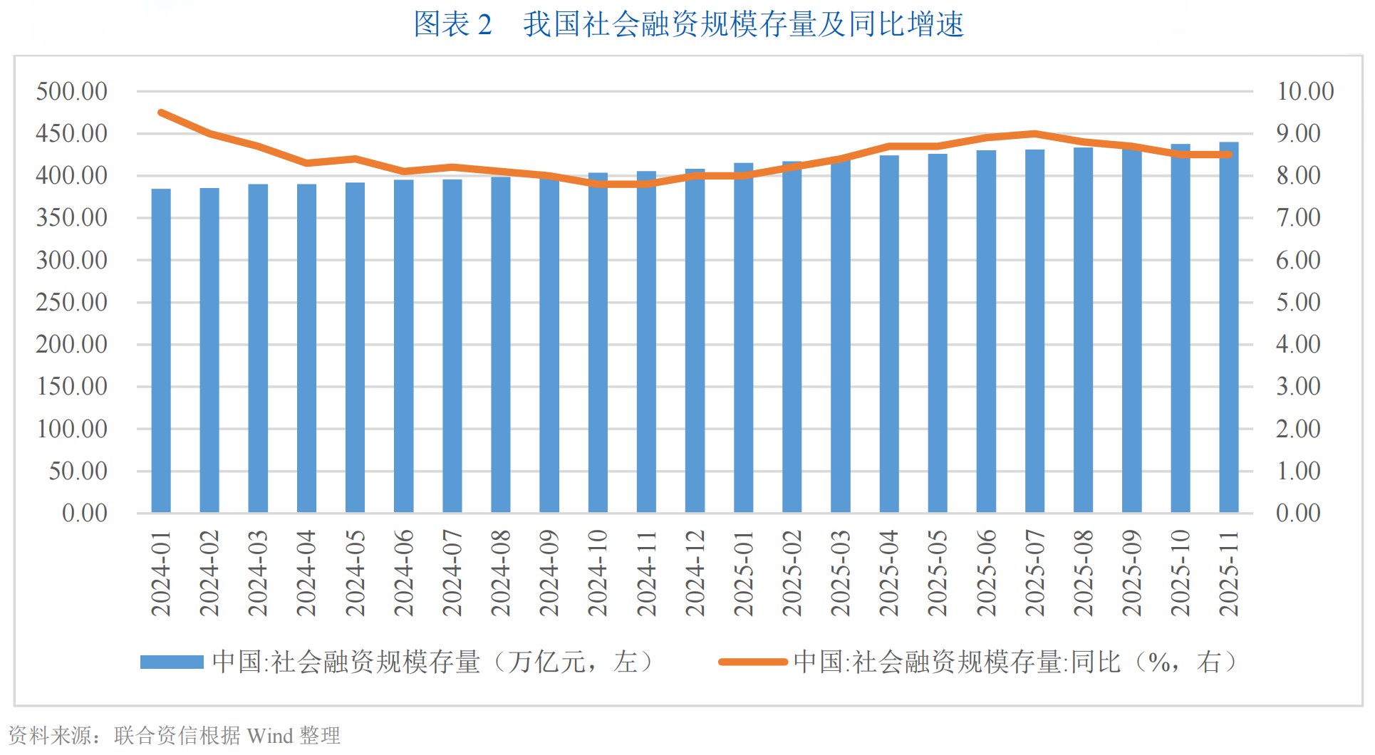 2025年前三季度,我國(guó)M2增速呈波動(dòng)增長(zhǎng)態(tài)勢(shì),其在7月達(dá)到年內(nèi)高點(diǎn)8.80%后,持續(xù)回落至2025年11月末的8.00%。全國(guó)社融同比增速維持相同的波動(dòng)態(tài)勢(shì),增速自7月后持續(xù)回落,11月末增速為8.50%。社會(huì)融資成本方面,2025年5月,5年期LPR下調(diào)10bp至3.50%;央行數(shù)據(jù)顯示,9月,企業(yè)新發(fā)放貸款加權(quán)平均利率約3.1%,較上年同期低40bp,個(gè)人住房新發(fā)放貸款利率3.1%,較上年同期低20bp,融資成本處于低位。