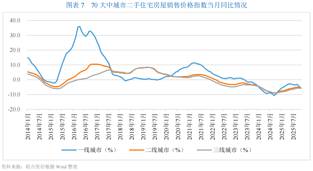 根據(jù)70大中城市二手房?jī)r(jià)格變化來(lái)看,一線(xiàn)城市二手房?jī)r(jià)2023年二季度開(kāi)始下跌,降幅在2024年10月出現(xiàn)反彈,但在2025年5月重新進(jìn)入下降區(qū)間;二三線(xiàn)城市二手房?jī)r(jià)于2021年三季度開(kāi)始下跌,降幅在2023年小陽(yáng)春微幅反彈后一路下降,并于2024年10月觸底,隨后迎來(lái)降幅收窄并趨于穩(wěn)定。新建商品住宅價(jià)格變化方面,2024年以來(lái),一線(xiàn)、二線(xiàn)及三線(xiàn)城市價(jià)格指數(shù)當(dāng)月同比情況變動(dòng)趨勢(shì)趨同,均實(shí)現(xiàn)“V型”反轉(zhuǎn),但進(jìn)入11月,房?jī)r(jià)指數(shù)同比均有所回落,后續(xù)走勢(shì)不明朗。
