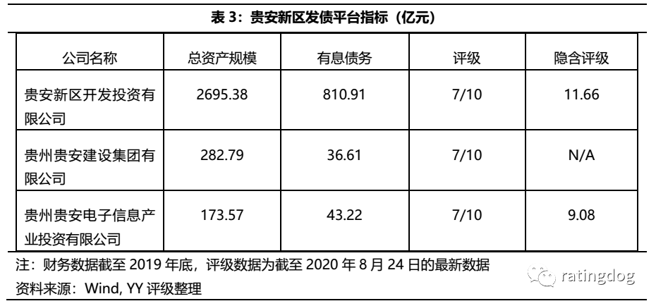 貴安新區目前有三家城投平臺,YY評級均為7/10,隱含評級更高,資質較弱。資產規模最大的貴安新區開發投資有限公司是貴安新區內唯一的開發主體,承擔新區基礎設施建設、產業園區建設、投融和產業發展的職責,截至2019年底總資產規模為2695.38億,有息債務為810.91億。其余兩家發債平臺的資產規模和有息債務規模均較小,其中貴州貴安建設集團有限公司為貴安新區開發投資有限公司的全資子公司,是貴安新區重要的基礎設施和公用事業建設主體,貴州貴安電子信息產業投資有限公司截至19年底總資產為282.79億,有息債務為36.61億,主要承擔貴安電子信息產業園的開發建設、投融資、產業發展、資產經營管理及招商引資等工作。