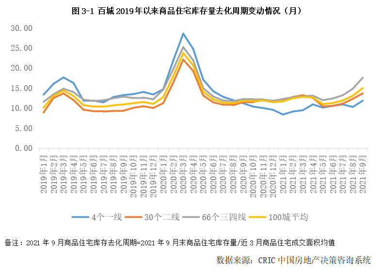 9月,因整體市場下行加劇,成交持續轉冷,狹義庫存保持穩步上揚態勢,因而去化周期加速上行,由2021年8月末的13.04個月上漲至14.92個月。