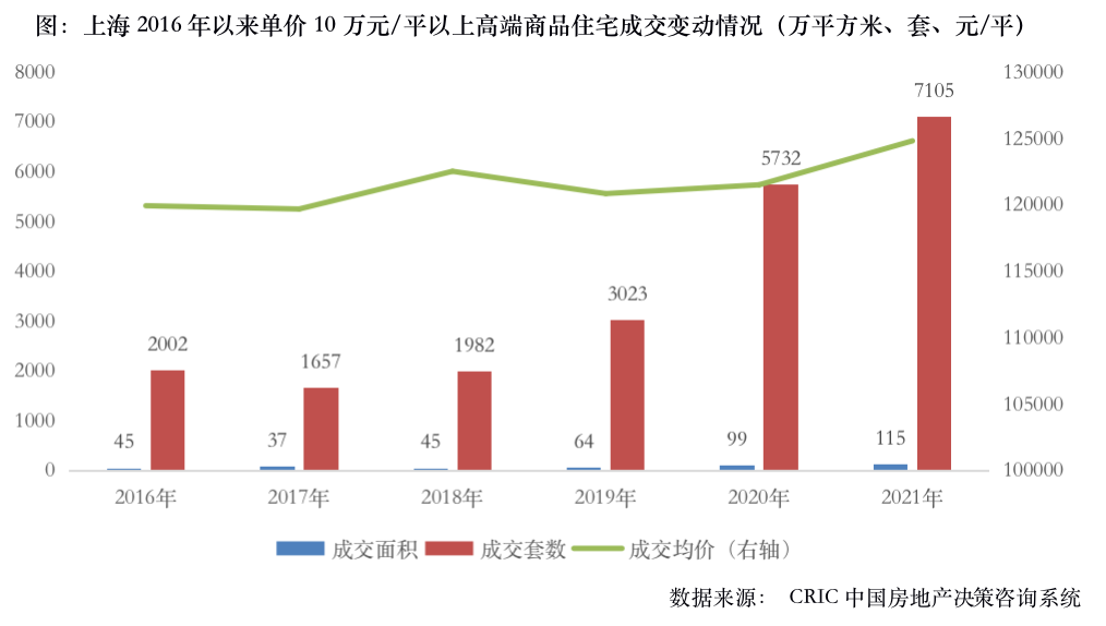 縱觀上海單價10萬元/平以上高端商品住宅年度成交變動情況,2019年以來成交面積節(jié)節(jié)攀升,2021年更是創(chuàng)歷年新高,全年成交面積達115萬平方米,成交套數(shù)達7105套,整體成交均價呈現(xiàn)穩(wěn)中微增態(tài)勢,高位持穩(wěn)在12萬元/平。項目層面來看,即便在2021年下半年全國市場行情轉(zhuǎn)淡的大背景下,翠湖五集10月15號開盤推出106套房源,九廬(陸家嘴濱江苑)12月8號開盤推出152套房源,仍可實現(xiàn)當天售罄。