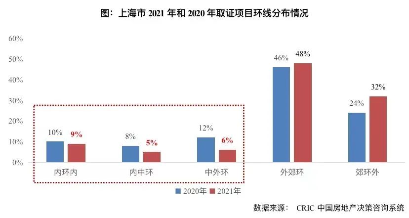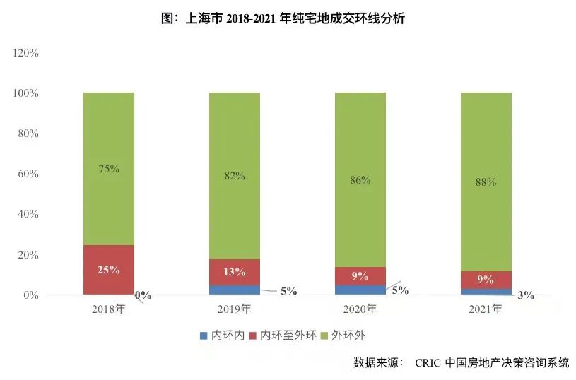 究其根本,新增供應(yīng)短缺的背后實則是外環(huán)內(nèi)宅地供應(yīng)稀缺,從2018-2021年純宅地成交環(huán)線來看,仍以外環(huán)外為主,占比逐年遞增,已近9成,外環(huán)內(nèi)累計占比則逐年回落,2021年僅為12%,而內(nèi)環(huán)內(nèi)市中心純宅地更是稀缺,2021年占比僅為3%。由此不難推斷,2022年上海市區(qū)單價10萬元/平以上新盤仍將延續(xù)此前的供不應(yīng)求,“一房難求”的高熱成交情況短期還是難以緩解。