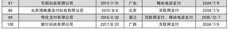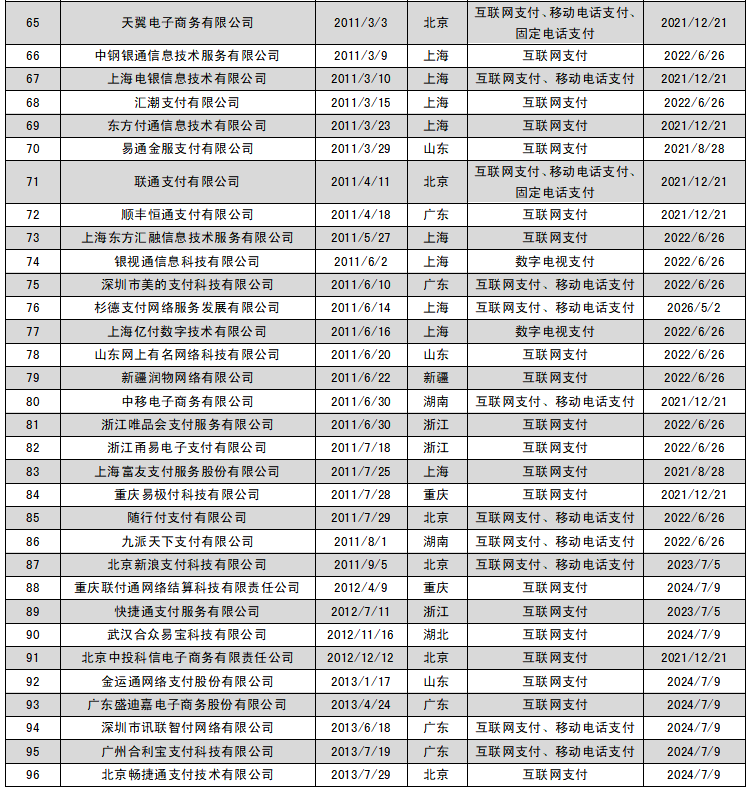 √ 獲網絡支付類(互聯網支付、移動電話支付、固定電話支付、數字電視支付)牌照的有100家機構。其中,取得數字電視支付及固定電話支付牌照的分別僅有4家。同時取得互聯網支付、移動電話支付、固定電話支付的有3家公司,分別為上海匯付數據服務有限公司、天翼電子商務有限公司、聯通支付有限公司。