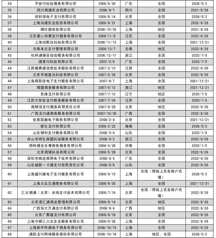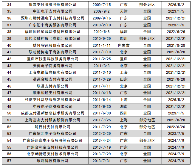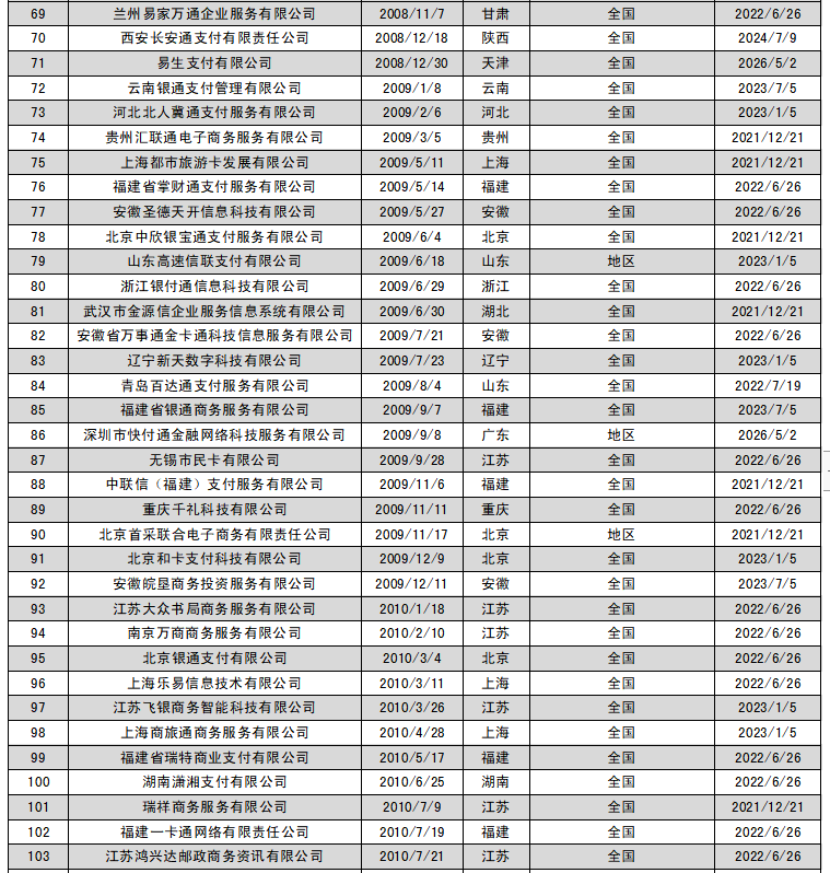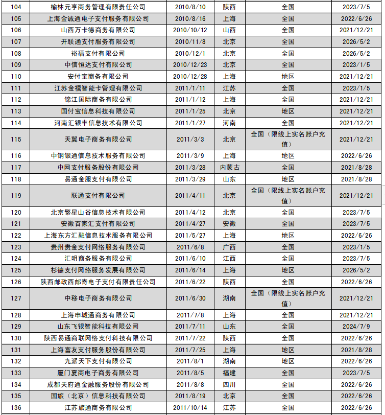 2021年5月13日,央行官網公布首批27張支付牌照續展結果,支付寶、財付通、銀聯商務、資和信、銀盛支付、通聯支付等24家支付機構全部通過續展。廣州銀聯網絡支付有限公司、北京數字王府井科技有限公司、北京銀聯商務有限公司擬與其控股股東銀聯商務股份有限公司開展整合工作,向人民銀行提交了中止續展審查申請,在中止審查期間繼續開展業務。