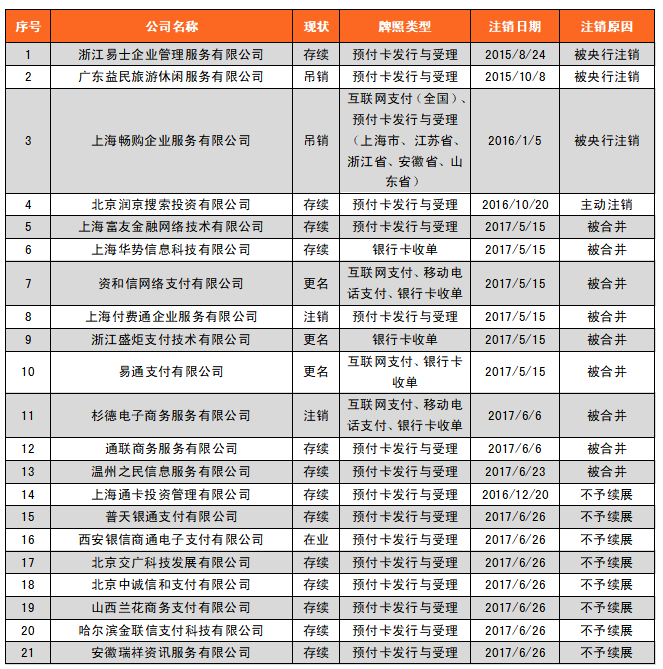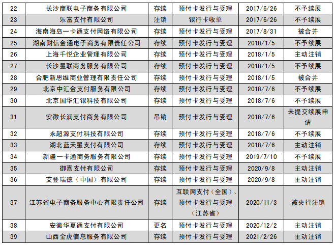 據央行官網公布數據顯示,目前已注銷牌照的機構有39家,注銷原因中,被央行吊銷牌照的機構有4家;因被合并而注銷牌照的有11家;被央行決定不予續展的有16家;主動申請注銷的有7家;未提交續展申請的1家。