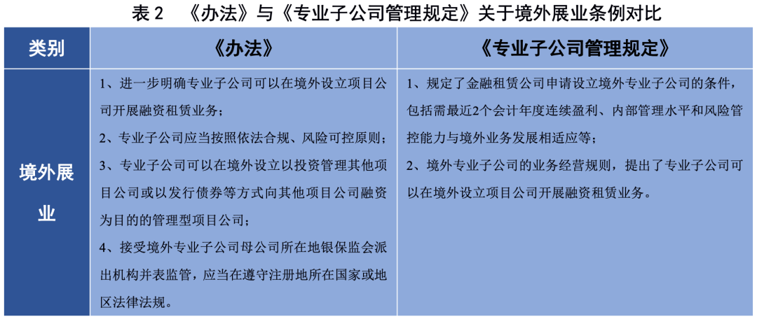 《辦法》的推出有利于規范金融租賃公司境外展業。2014年,原銀監會出臺《中國銀行業監督管理委員會辦公廳關于印發金融租賃公司專業子公司管理暫行規定的通知》(以下簡稱《專業子公司管理規定》),首次指出了金融租賃公司可以設立境外專業子公司,規定了金融租賃公司申請設立境外專業子公司的條件、境外專業子公司的業務經營規則。此次《辦法》為規范金融租賃公司境外展業的有效補充,明確了專業子公司可以在境外設立項目公司開展融資租賃業務,專業子公司應當按照依法合規、風險可控原則,保持境外項目公司層級結構清晰、簡單、透明;要求境外項目公司原則上不得超過2級?!掇k法》新增了專業子公司可以在境外設立以投資管理其他項目公司或以發行債券等方式向其他項目公司融資為目的的管理型項目公司,設立管理型項目公司將促進項目公司業務規范管理,同時便于境外項目公司融資。此外,境外專業子公司設立的項目公司應當接受境外專業子公司母公司所在地銀保監會派出機構并表監管,應當遵守注冊地所在國家或地區的法律法規。