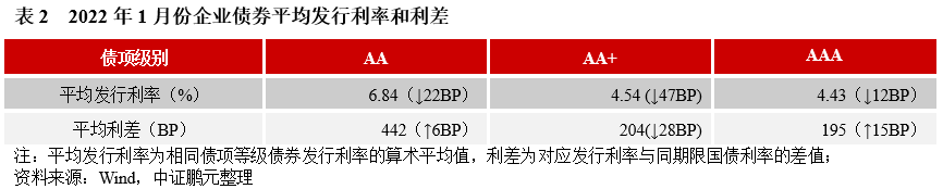 2022年1月,企業(yè)債券最高發(fā)行利率為8.00%,較上月上行50BP;最低發(fā)行利率為2.94%,較上月下行24BP。從債券級(jí)別來看,與上月相比,本月各級(jí)別企業(yè)債平均發(fā)行利均下行,其中AA+級(jí)下行47BP,幅度最大;平均發(fā)行利差方面,AA+級(jí)企業(yè)債平均發(fā)行利差收窄28BP,AA級(jí)和AAA級(jí)分別擴(kuò)大6BP和15BP。