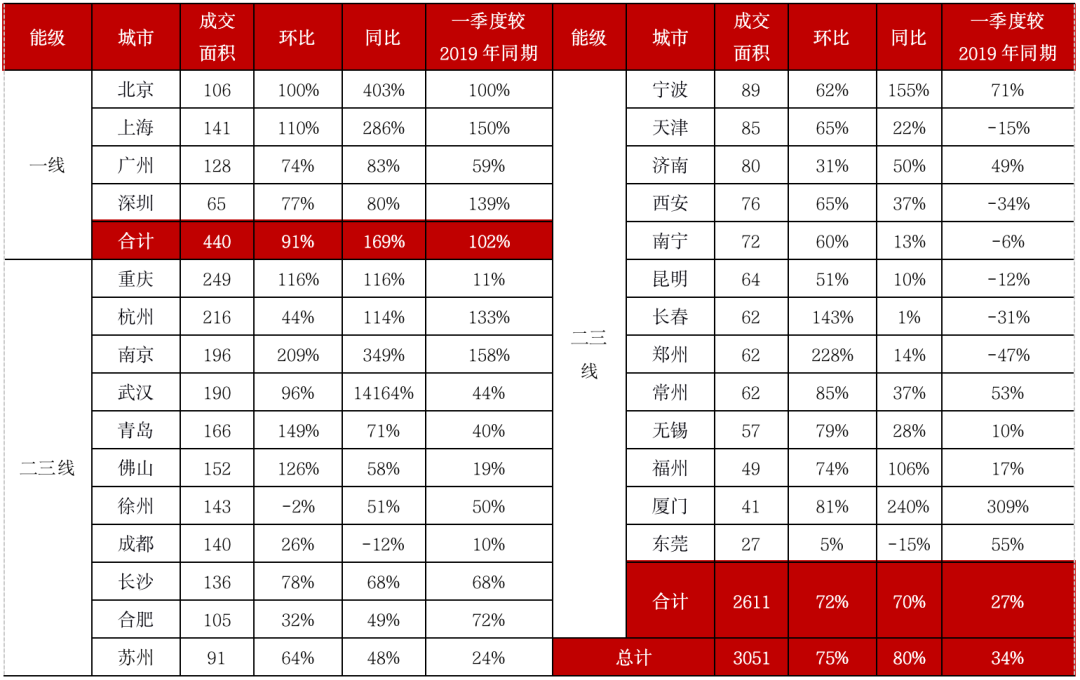 3月,28個典型城市商品住宅成預計成交規模將達3051萬平方米,同、環比分別增80%和75%。整體而言,一季度較2019年同期增長34%,一線城市繼續領漲,二三線城市分化特點逐漸體現。
