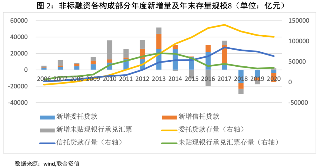 [8]人民銀行公布的非標融資規模存量數據也是始于2015年,此前數據為聯合資信根據各年增量數據推算。可能由于口徑變化,導致由此推算而得的2006、2007兩年的委托貸款存量為負值。