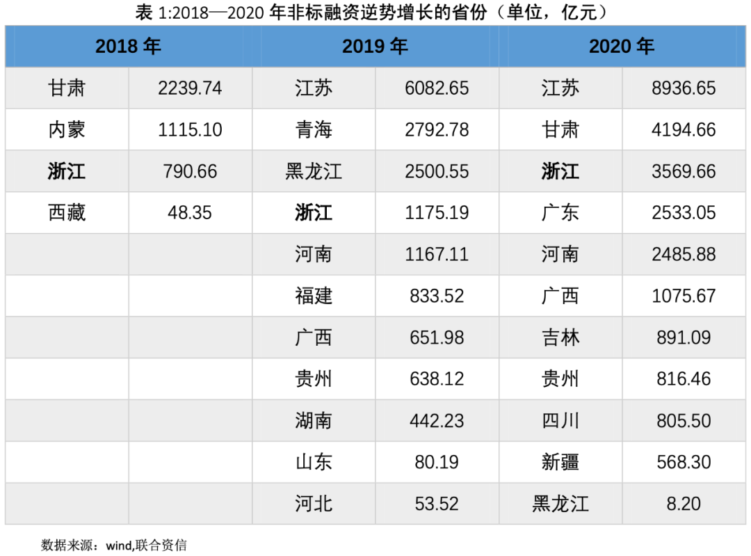 分年度觀察,2018年只有甘肅等四省份逆勢擴張,2019年逆勢擴張的是江蘇等11個省份,2020年逆勢擴張的省區仍然為11個,主要是江蘇、甘肅等省份。進一步可以看到,浙江是唯一一個非標融資增量在2018—2020年連續3年正增長的省份,其次江蘇、甘肅、河南、黑龍江、廣西五省區三年中有二年實現正增長,此外還有青海、吉林、湖南、四川、河北、廣東、內蒙等11個省區三年中有一年實現正增長,其余各省區都是連續三年負增長。