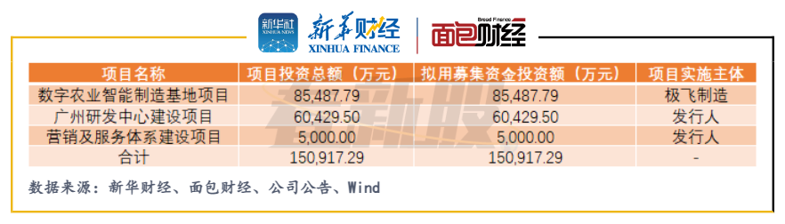 極飛科技此次擬公開(kāi)發(fā)行普通股不超過(guò)6001萬(wàn)股,約占公司發(fā)行后總股本的15%,募資金額約15.09億元,主要用于數(shù)字農(nóng)業(yè)智能制造基地項(xiàng)目、廣州研發(fā)中心建設(shè)項(xiàng)目、營(yíng)銷(xiāo)及服務(wù)體系建設(shè)項(xiàng)目。