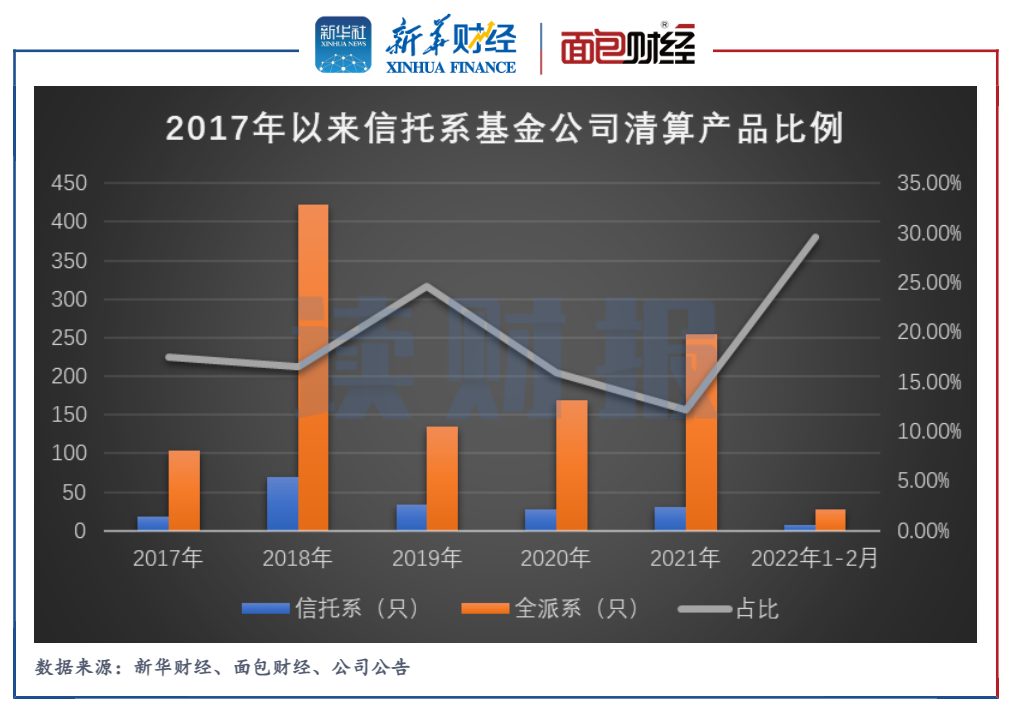 進(jìn)入2022年,在2個月的時間內(nèi),共有27只公募產(chǎn)品開始清盤,與去年同期的28只基本持平。其中,信托系基金公司共有8只產(chǎn)品進(jìn)入清算程序,較去年同期的2只大幅增加。
