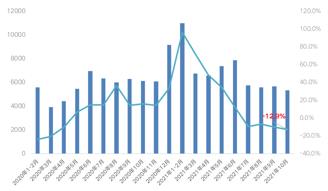 不過目前來看,定金與預(yù)收款月度同比增速正在持續(xù)走低,2021年10月,定金及預(yù)收款新增5351億元,同比下降12.9%,已降至年內(nèi)低位。