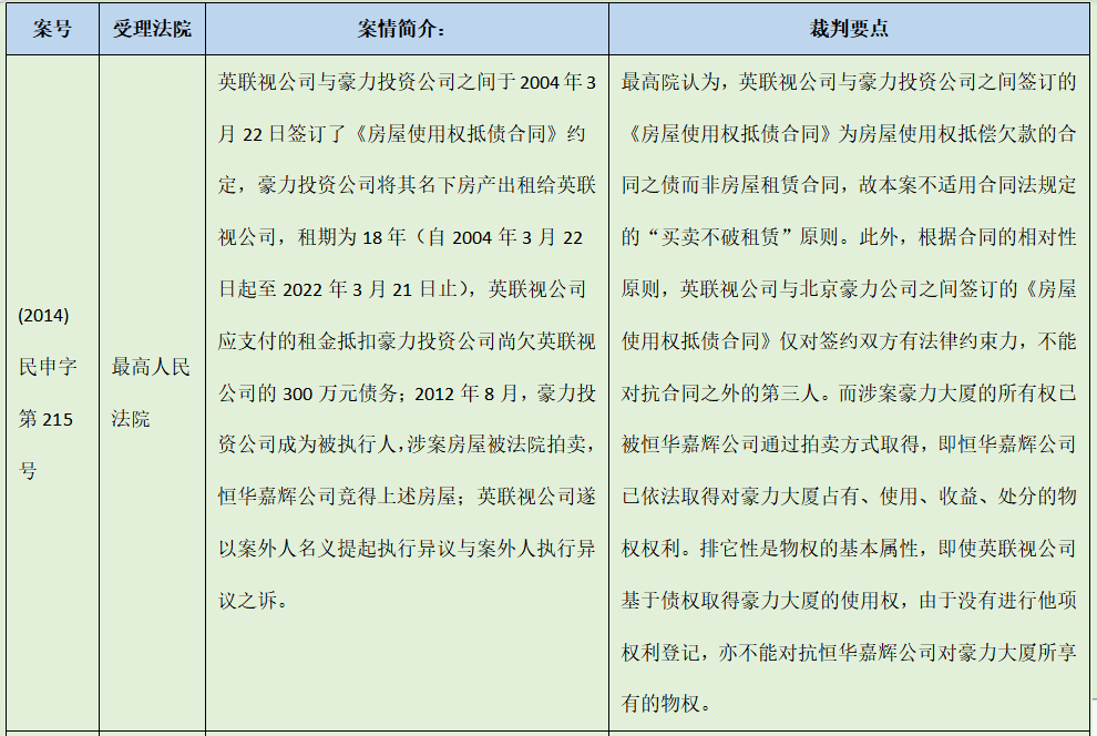 4、《最高院關(guān)于人民法院辦理執(zhí)行異議和復(fù)議案件若干問題的規(guī)定(2020修正)》第31條:“承租人請(qǐng)求在租賃期內(nèi)阻止向受讓人移交占有被執(zhí)行的不動(dòng)產(chǎn),在人民法院查封之前已簽訂合法有效的書面租賃合同并占有使用該不動(dòng)產(chǎn)的,人民法院應(yīng)予支持。”