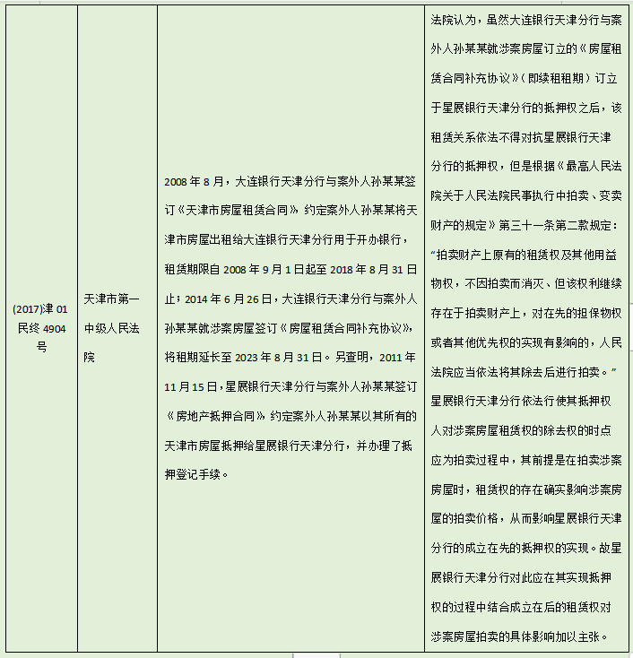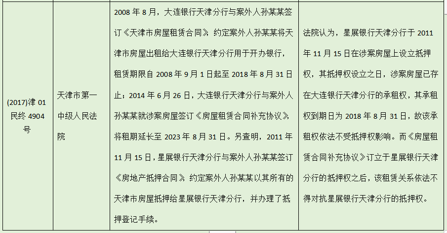 筆者評(píng)析:根據(jù)上述案例,筆者認(rèn)為所謂的“在先租賃權(quán)可以對(duì)抗抵押權(quán)”,是指租賃關(guān)系的存續(xù)不受抵押權(quán)的影響,承租人可以繼續(xù)占有租賃物,同時(shí)該租賃權(quán)對(duì)于抵押物受讓人依然有效,但是不代表租賃權(quán)人可以阻礙抵押權(quán)人行使優(yōu)先受償?shù)臋?quán)利。而對(duì)于如何消除在后租賃權(quán),目前僅有最高院在《拍賣、變賣財(cái)產(chǎn)的規(guī)定》中做了原則性規(guī)定,尚缺乏系統(tǒng)可操作的指導(dǎo)意見,例如在(2017)津01民終4904號(hào)案件中,法院雖認(rèn)可了星展銀行天津分行抵押權(quán)優(yōu)先于續(xù)租的租賃權(quán),但具體如何在拍賣過程中有效滌除抵押權(quán),依然不得要領(lǐng)。