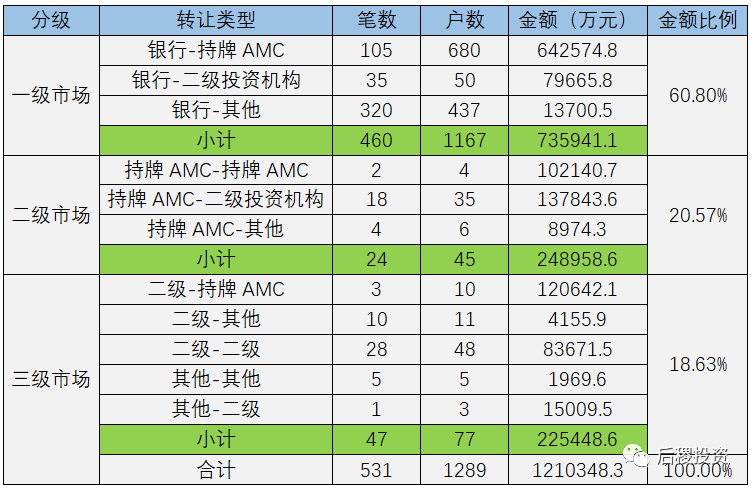 按慣例,我們將行業(yè)市場(chǎng)分為三級(jí):銀行出讓債權(quán)為一級(jí)市場(chǎng);本地持牌AMC或代持機(jī)構(gòu)在當(dāng)?shù)爻鲎寕鶛?quán)為二級(jí)市場(chǎng),其余的債權(quán)轉(zhuǎn)讓為三級(jí)市場(chǎng)。