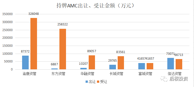 從圖表上能夠看出6家持牌AMC“兩級(jí)分化”明顯,渝康資管、東方資管、華融資管、長(zhǎng)城資管受讓金額遠(yuǎn)多于出讓金額;富成資管、信達(dá)資管出讓金額與受讓金額保持平衡。