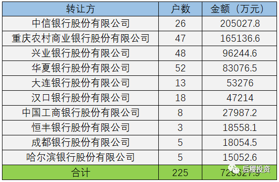 中信銀行出讓金額連續(xù)兩年保持第一,建設(shè)銀行、浦發(fā)銀行、中國(guó)進(jìn)出口銀行、光大銀行、中國(guó)銀行、廈門(mén)銀行跌出前十,華夏銀行、大連銀行、漢口銀行、恒豐銀行、成都銀行、哈爾濱銀行則進(jìn)入前十榜單。
