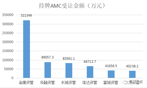 從上圖看,渝康資管表現(xiàn)亮眼,受讓金額遙遙領(lǐng)先,其余5家持牌AMC受讓規(guī)模相差不大。