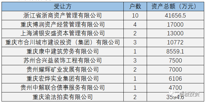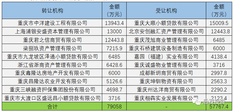 轉(zhuǎn)讓機(jī)構(gòu)中,上述10家轉(zhuǎn)讓機(jī)構(gòu)出讓總金額近8億元,在三級(jí)出讓市場(chǎng)中占38%;受讓機(jī)構(gòu)中,上述10家受讓機(jī)構(gòu)受讓總金額近6億元,在三級(jí)受讓市場(chǎng)中占18.3%。相對(duì)其他省份而言,在重慶不良資產(chǎn)三級(jí)市場(chǎng)上,多次見(jiàn)到小額貸款公司的身影,該特征與重慶當(dāng)?shù)卣呦⑾⑾嚓P(guān)。