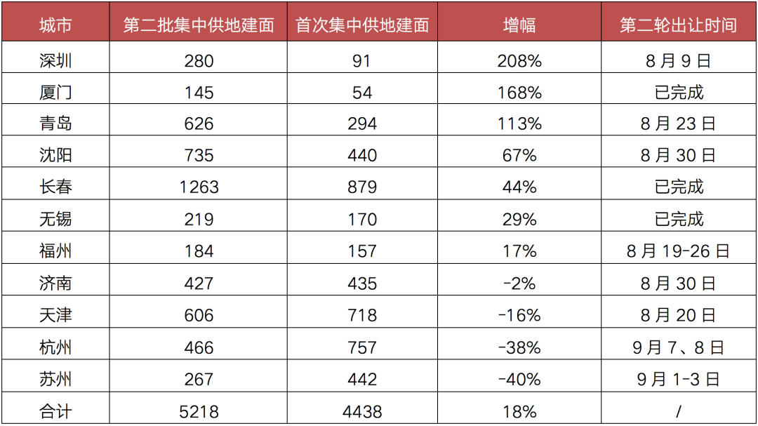 具體城市而言,深圳、廈門、青島供應規模均實現翻番,其中深圳第二輪土拍供地規模較首輪增加208%。沈陽、長春、無錫、福州供地規模也有明顯上漲,房企拿地機會明顯增加。