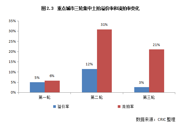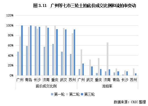 具體城市來看,僅有寧波、杭州、合肥、深圳、成都5城市溢價率達5%及以上,其余城市溢價率均在5%以下,長春、天津、武漢、廣州等城市均全部為底價成交。相比之下,重點城市首輪溢價率大都處于高位,像重慶、深圳、廈門、杭州、寧波等城市溢價率均超20%;二輪雖然熱度明顯下降,但仍有廈門、福州、深圳等少數城市溢價率超過10%。至于流拍率,雖然第三輪較第二輪明顯好轉,但依然處于高位,整體流拍率達21%。